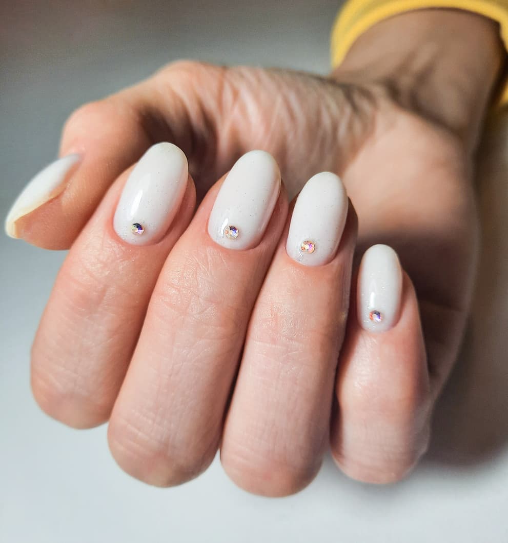 El siguiente estilo es sin duda el más delicado y sutil de la lista. Es tan sencillo que lo puedes hacer tú misma, necesitas barniz blanco y 10 lentejuelas plateadas para uñas.