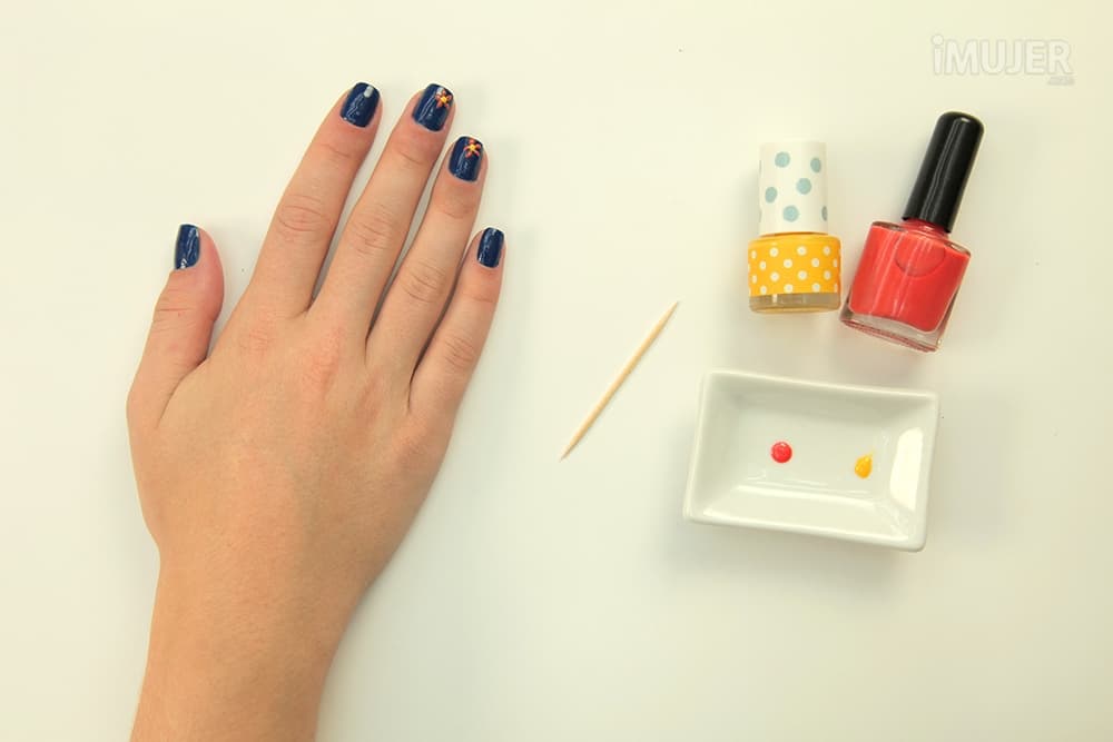 Cuando termines de crear la forma de la flor con los pétalos, moja la otra punta del mondadientes en el otro esmalte y haz con un puntito el centro de la flor.