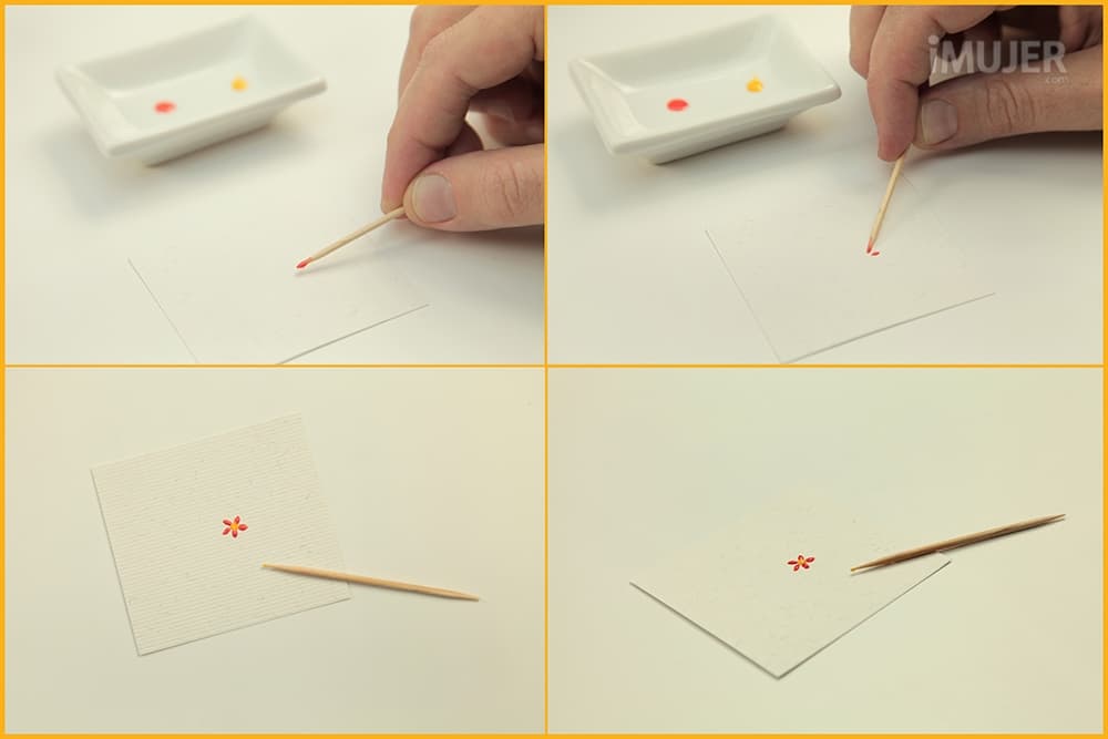 Coloca unas gotas de dos esmaltes en el plato. Moja la punta del mondadientes sobre el color que usarás para los pétalos y dibújalos en el papel.
