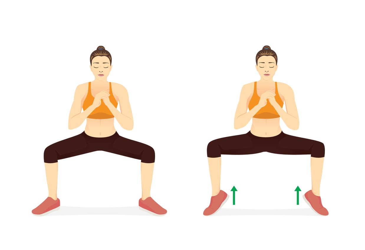 La sentadilla con levantamiento de talones consiste en dos ejercicios combinados en uno. El primero es la sentadilla profunda habitual, pero sin subir el cuerpo por completo. En su lugar, hay que mantener la posición a la mitad y elevar los talones para quedar en puntas.