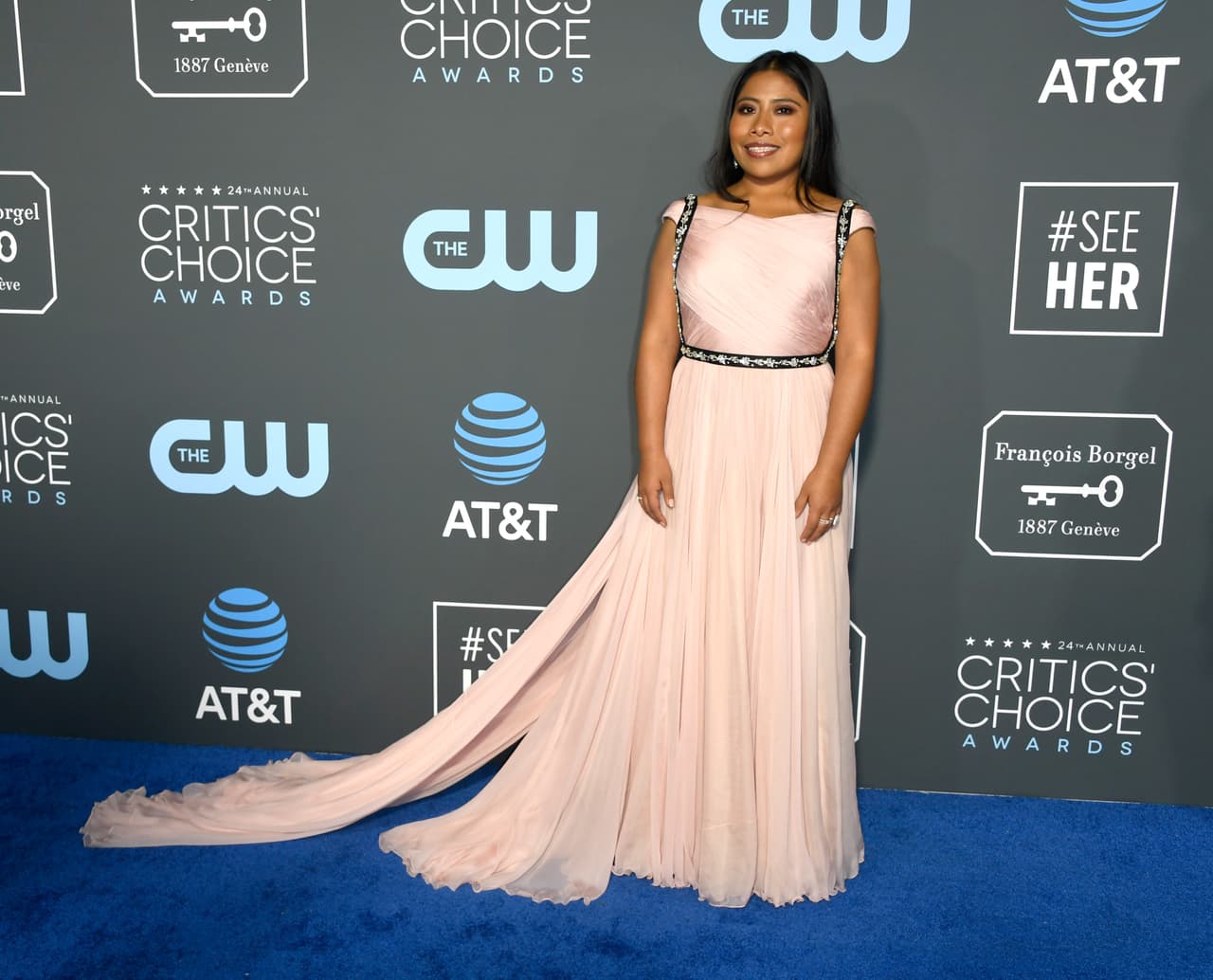En la alfombra de los Critics Choice Awards, Yalitza emuló el glamour del antiguo Hollywood con este hermoso vestido rosa de la reconocida firma Prada.