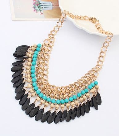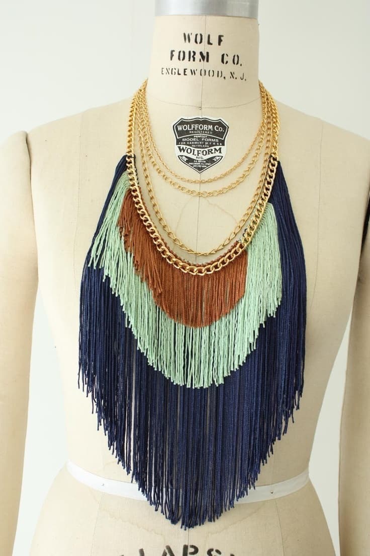 Este es un collar compuesto por varios collares diferentes, trata de una gargantilla tejida con cadenas, abalorios, hilos y cintas...¡lo puedes hacer tú misma con un poco de imaginación!