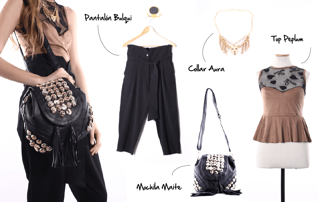 Te proponemos también el pantalón tipo babucha Bulqui, que es de tiro alto y lleva un cinturón. El top Peplum, de textura gamuzada y escote de tul con estampa, es una idea perfecta para cortar con tanto negro. Y nada mejor que el collar Aura para completar el look. ¿Qué te parece?
