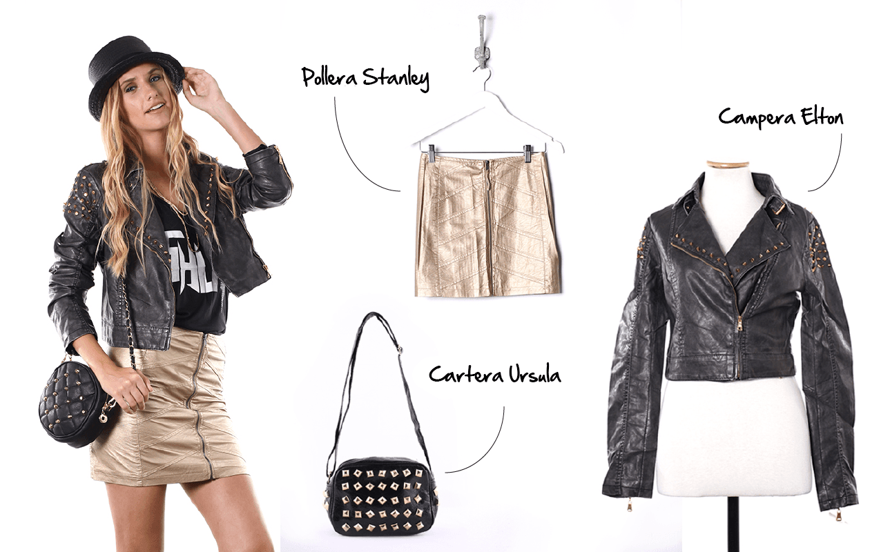 Las tachas dan su presente tanto en la cartera Úrsula como en la campera Elton. Completá este outfit con un sobrero y una remera con estampa, y preparate para sorprender.