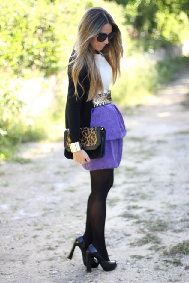 Para armar este outfit necesitas un vestido corto, o bien una blusa y una falda que puedas combinar; algún cinturón sofisticado como para la noche; medias negras; stilettos negros, cardigan o blazer también negros o de algún color que combine con las prendas; y una cartera de mano.