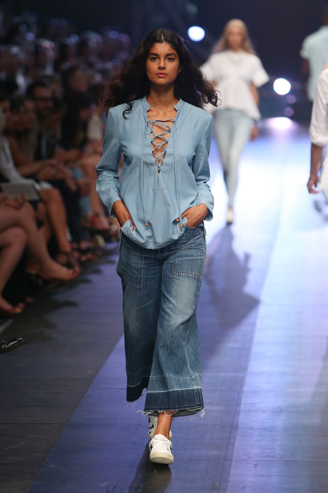 Si tu cuerpo tiene forma de triángulo invertido, los elementos que crean volumen en la zona de las caderas, juegan a tu favor: bolsillos, hardware, costuras atravesadas, cotillas horizontales y diagonales, etcétera.
