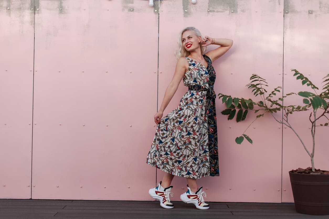 Para vestidos con estampados, lo mejor es usar tenis que contengan la misma paleta de colores que el vestido, para así darle un toque sumamente divertido y, lo más importante, veraniego.