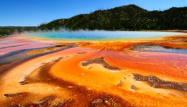 La llamada Grand Prismatic Spring, conocida en español como Gran Fuente Prismática, es la mayor fuente de aguas termales de Estados Unidos y la tercera más grande del mundo. Además de su magnitud, es mundialmente conocida por sus impresionantes colores, que se deben a la presencia de una bacteria pigmentada que se aloja en los minerales del suelo. Las tonalidades e intensidad del color dependen de la temperatura.