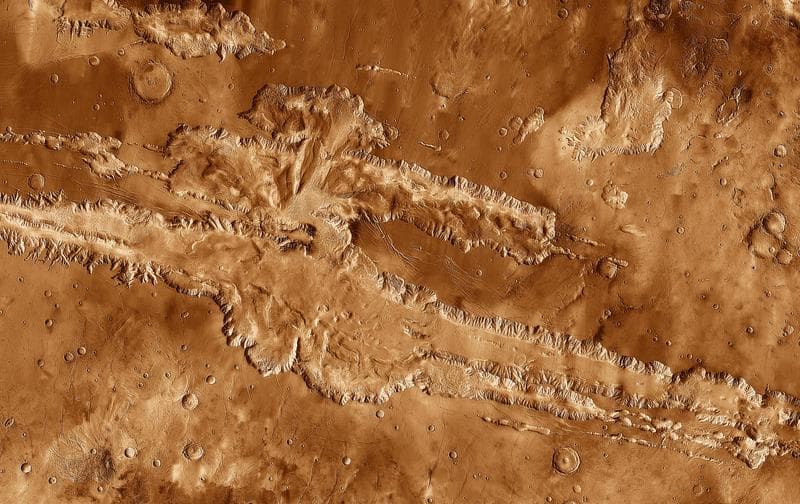 Así es, también tiene el cañón más profundo de todo el Sistema Solar. Se trata del Valles Marineris, que se extiende por 4000 km de longitud desde el ecuador marciano y tiene regiones con 7 km de profundidad.