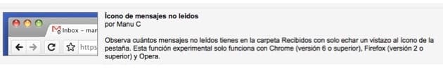 Lo que hace esta función, es añadir el número de mensajes nuevos en el icono que aparece en la pestaña de Gmail en el navegador, por lo que no tendrás que ingresar una y otra vez al webmail para comprobar si tienes nuevos e-mails.