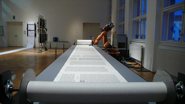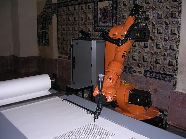 Presentado en el Centro Andaluz de Arte Contemporáneo (CAAC) de Sevilla, el Bios Bible es una máquina que escribe con paciencia y precisión todas las líneas caligráficas de la Biblia con mucho mayor empeño que el que pondría un sacerdote en su escritorio bajo la luz de una vela.