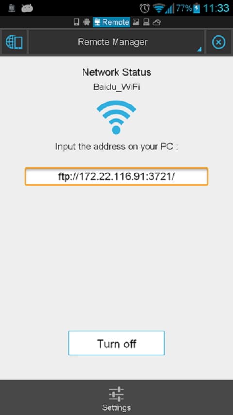 Una vez en este lugar verás que la aplicación ha detectado la red WiFi a la que estas conectado, si tocas en el botón "Encender" esta te entregará un número de IP el cual debes insertar en tu programa de FTP o simplemente en el navegador. Hecho esto podrás ver todos los archivos de tu móvil en la PC e inclusive reproducirlos o modificarlos.