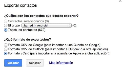 Verás la lista de todos tus Contactos. Cliquea sobre Más y selecciona Exportar. Se nos ofrecerán varias opciones de exportación.