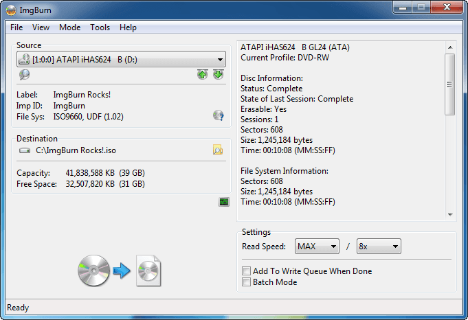 ImgBurn es otro programa gratuito para grabar discos que cuenta con una muy bien ganada popularidad. Este programa funciona tanto en Windows como en Linux, bajo la utilización de Wine. Aquí encontrarás todas las herramientas para grabar todo tipo de discos tanto CDs como DVDs.