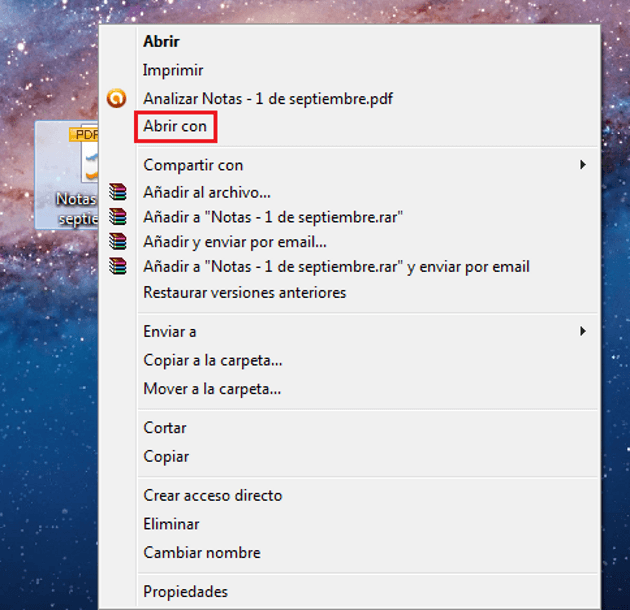 Para arrancar debemos hacer click derecho sobre cualquier archivo de PDF. Una vez que se ha desplegado el menú debemos hacer click en " Abrir con".