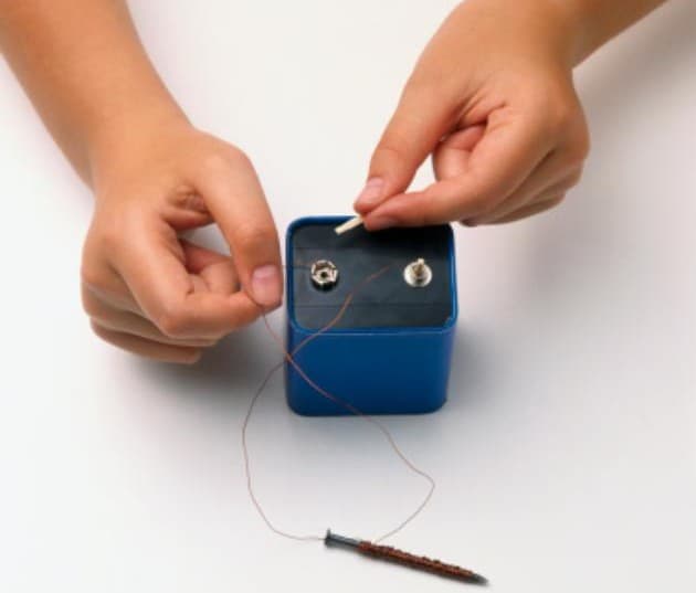 Enrollar el cable alrededor del clavo en forma de espiral, procurando que no se superponga y dejando 20 cm. libres en cada extremo del clavo. Si es necesario, cortar el cable para que no haya más de 20 cm. en cada una de las puntas. Quitar aproximadamente 2 cm del recubrimiento plástico del cable en cada extremo y colocar cada uno de éstos en la batería (ten cuidado en este punto, el cable puede calentarse considerablemente). ¡ Tu electroimán está listo! Acerca la punta del clavo a los elementos metálicos y observa qué sucede.