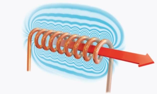 En este dispositivo hay un alambre o un cable enrollado, lo que hace que el campo magnético sea más potente. Los objetos de hierro o metal que están enrollados por este cable son consecuentemente imantados. La combinación de energía eléctrica, el cable en espiral y un material conductor, forman el dispositivo que conocemos como electroimán.