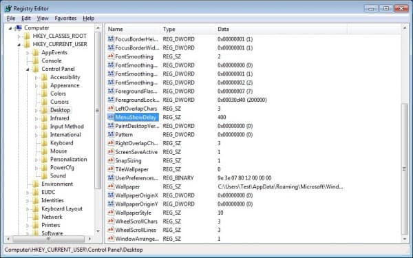 Dentro del registro busca por la opción HKEY_CURRENT_USER dentro de este expande el árbol de Control Panel, después el de Desktop. En el panel de la derecha aparecerá una opción que dice MenuShowDelay. El valor viene indicado como 400, y es el retraso que hay entre hacer clic y abrir un programa; viene dado en milisegundos. Puedes establecer un valor que vaya entre 400 y 1.