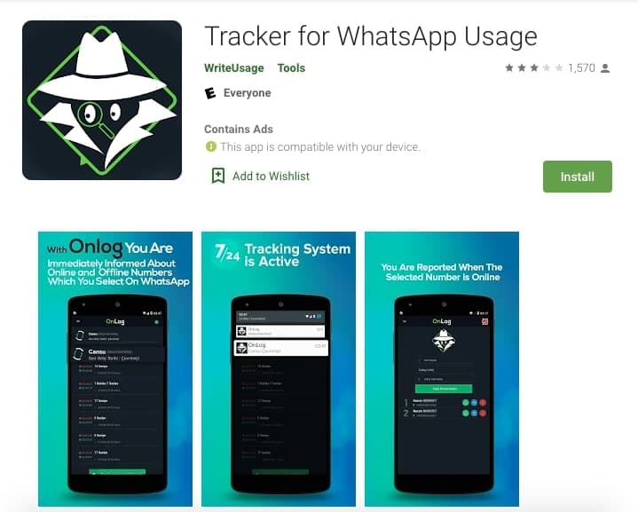 WOnLog – Online Tracker for WhatsApp es una de las apps más confiables para rastrear contactos. En Play Store aparece como Tracker for WhatsApp Usage.