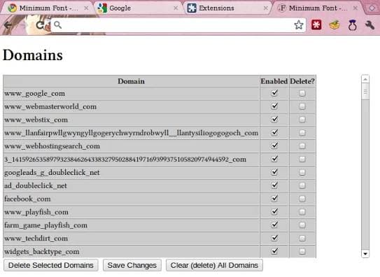 A continuación, ve al menú Herramientas, Extensiones y cliquea sobre Configuración bajo Minimum Font.