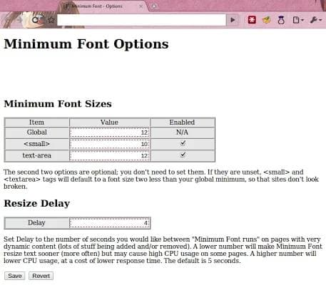 Finalmente, verás la sección Delay, ello corresponde a los segundos que se tomará Minimum Font antes de modificar la visualización de la fuente al tamaño que determinaste, así tienes la posibilidad de verlo primero sin cambios, aunque los desarrolladores nos advierten que el proceso puede ralentizar la velocidad de procesamiento.