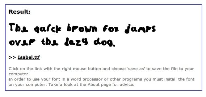 Ahora, cliquea en Send File y espera mientras tu letra se procesa para crear la tipografía personalizada. Una vez lista, se te mostrará una frase escrita con tu fuente y, para descargarla a tu equipo, cliquea sobre el nombre que le diste, para luego guardarla en tu computadora.