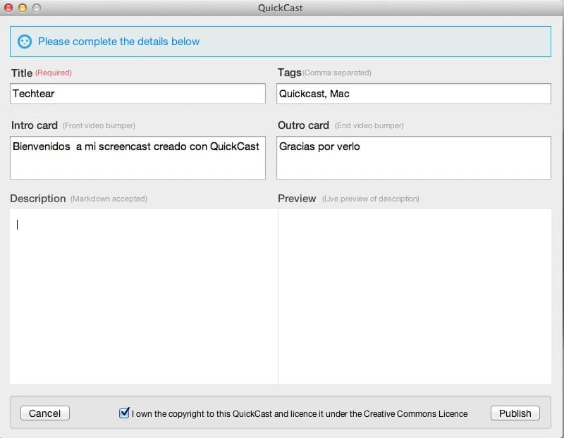 Una vez que terminaste de grabar, cliquea sobre el icono de QuickCast y luego en Stop. Verás como aparece una ventana en la que podrás pre-visualizar el video y, si te gusta, subirlo a la red con un clic sobre Publish.