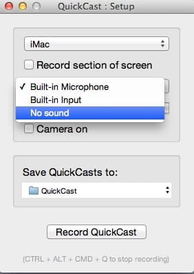QuickCast, te permite grabar tanto la pantalla del equipo, como también lo que muestra la webcam. Para activar esas segunda opción, marca la casilla Camera On. Verás que aparece un pequeño recuadro con lo actualmente enfoca la cámara de la Mac, pudiendo componer un video en que aparezca tanto la pantalla como tu imagen en vivo.