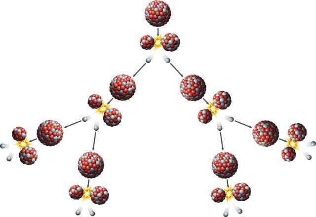 La fisión, como vemos en la imagen más abajo, consiste en la división del núcleo del átomo, gracias a un «bombardeo» de electrones, que produce una reacción nuclear en cadena descontrolada. Para que esto suceda es necesario el uso de materiales fisionables, como el uranio-235 o el plutonio-239. Según cuál sea el material utilizado se habla de bomba atómica de uranio o bomba atómica de plutonio.