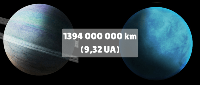 - Distancia entre Saturno y Urano: 1394 millones de km (9,32 UA)