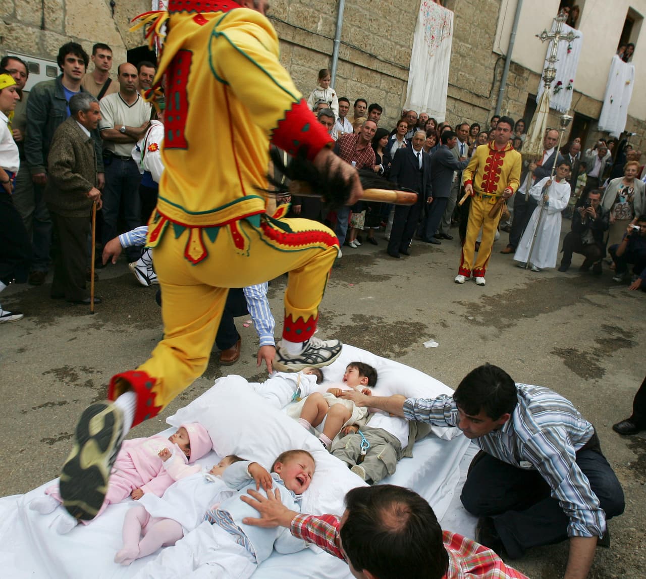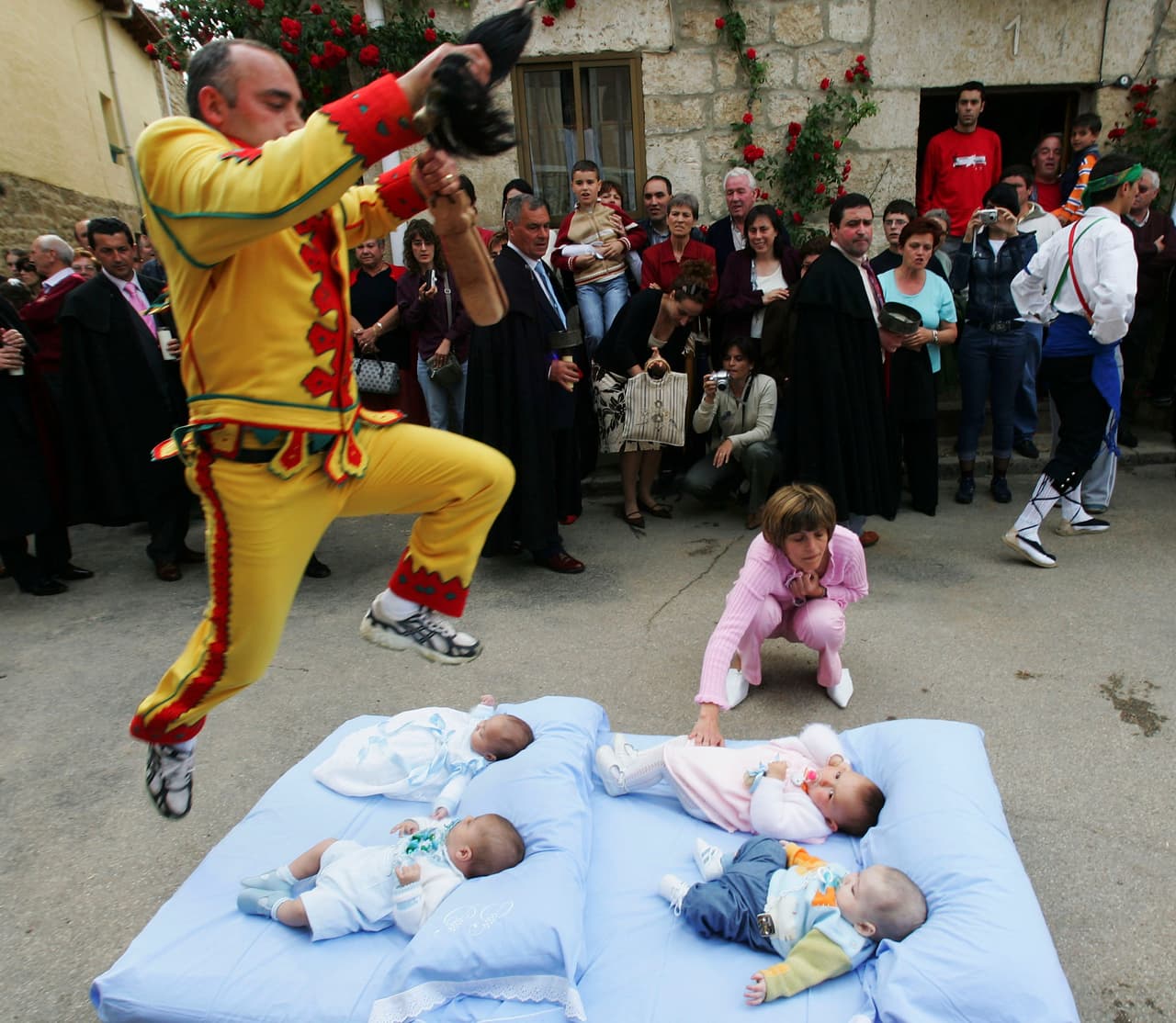 Esta sorprendente (y para muchos peligrosa) celebración se efectúa en el pueblito español de Castrillo de Murcia desde el año 1620, con el fin de alejar los malos espíritus de los niños nacidos durante ese año. Los festejos, organizados por la hermandad del Santísimo Sacramento de Minerva, se dan lugar a la semana siguiente de celebrase el Corpus Christi, a través de una pintoresca procesión que atraviesa todo el pueblo y que tienen como elemento mas distintivo el famoso salto de los recién nacidos.