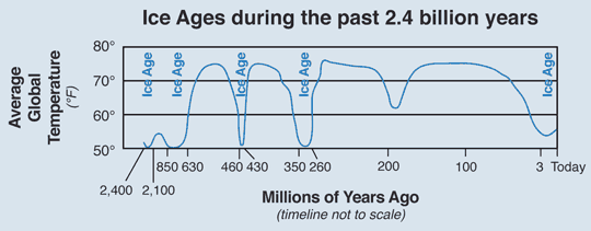 La imagen de más arriba muestra la temperatura global de los últimos 2400 millones de años —2,4 billions en inglés— expresada en grados Farenheit. Como vemos, las eras de hielo — Ice Age— se caracterizan por abruptas caídas de la temperatura, y relativamente rápidas subidas.
