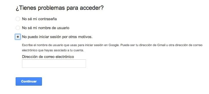 Lo primero es indicar una dirección alternativa para que Google pueda contactarte. A continuación se te harán una serie de preguntas sobre tu Gmail (fecha de creación, la contraseña que usabas, etc)