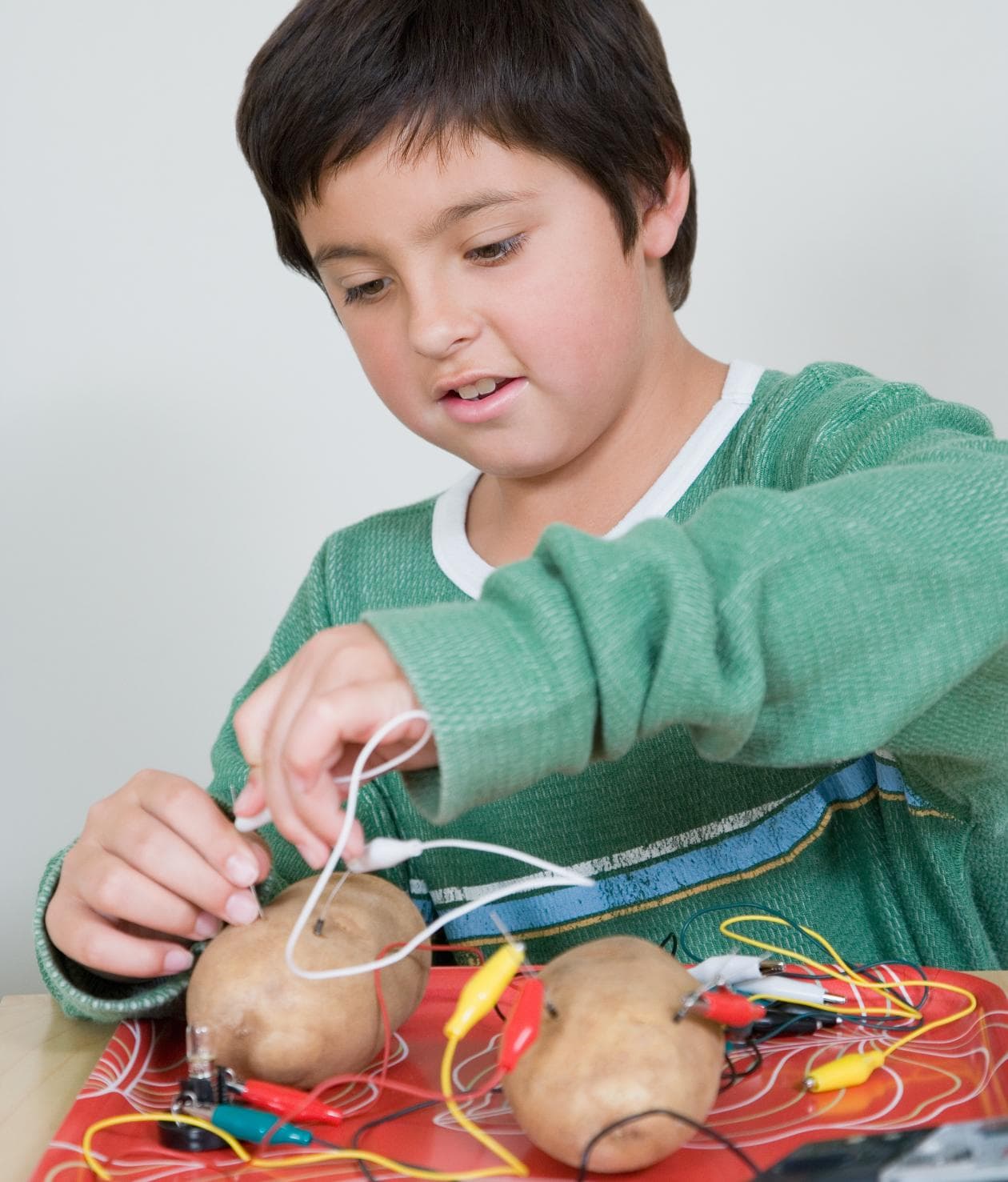 Abrir el compartimiento de las pilas del reloj y quitar cada una de éstas. Se podrá notar que donde estaban las pilas hay dos conexiones, las cuales alimentan el reloj con energía y que están señalizadas de dos formas: una con un signo positivo (+) y otra con uno negativo (-). Allí se conectaran las patatas, las cuales llamarás A y B y vas a conectar de determinada manera. En primer lugar, inserta un electrodo de cobre y uno de zinc en cada una de las patatas con bastante distancia entre una y otra de acuerdo al tamaño de la propia patata. Con un clip cocodrilo, conecta el electrodo de cobre en la patata A en el signo positivo del reloj y el de zinc en la patata B en la conexión negativa del reloj. Utilizando otro clip cocodrilo y un electrodo de zinc, conectar todo al electrodo de cobre de la patata B.