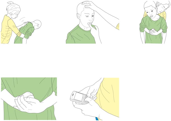 - Comprobar que la persona se asfixia. No se deben aplicar los primeros auxilios si la persona tose con fuerza y puede hablar, ya que la tos fuerte puede desalojar el objeto que bloquea las vías respiratorias.