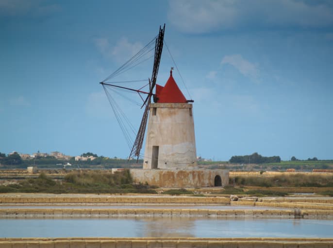 Luego de un desayuno abundante, con jugos, fruta fresca, huevos, embutidos, queso, pan fresco, bollos, mermeladas, miel, mantequilla, té y café (que es lo habitual en Marsala) nada mejor que llegarnos hasta la región de las salinas; desde lejos ya se divisa un gran molino de viento, luego aparecen los blanquísimos montículos de sal y los inmensos piletones. Toda esta zona es parte de la Reserva Natural de las Islas del Stagnone (o del Gran Estanque de Sal), desde el Cabo Lilybeo hasta San Teodoro. Se halla protegida de las fuertes olas del Mar Mediterráneo por la Isla grande que se interpone entre ellos.