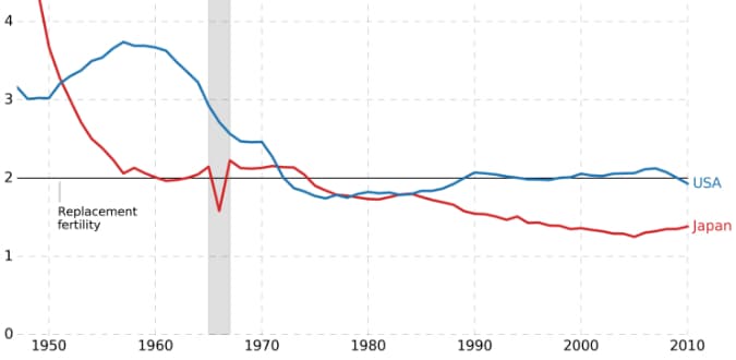 Este gráfico representa los índices de natalidad en Estados Unidos y Japón de 1950 a 2010. ¿Observan el pico pronunciado entre 1960 y 1970? Bueno, esa caída abrupta representa uno de los fenómenos más curiosos a nivel social que sucedió en Japón durante la segunda mitad de Siglo XX.