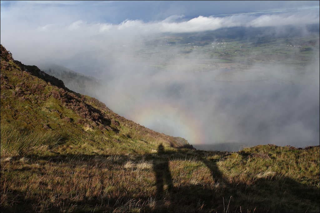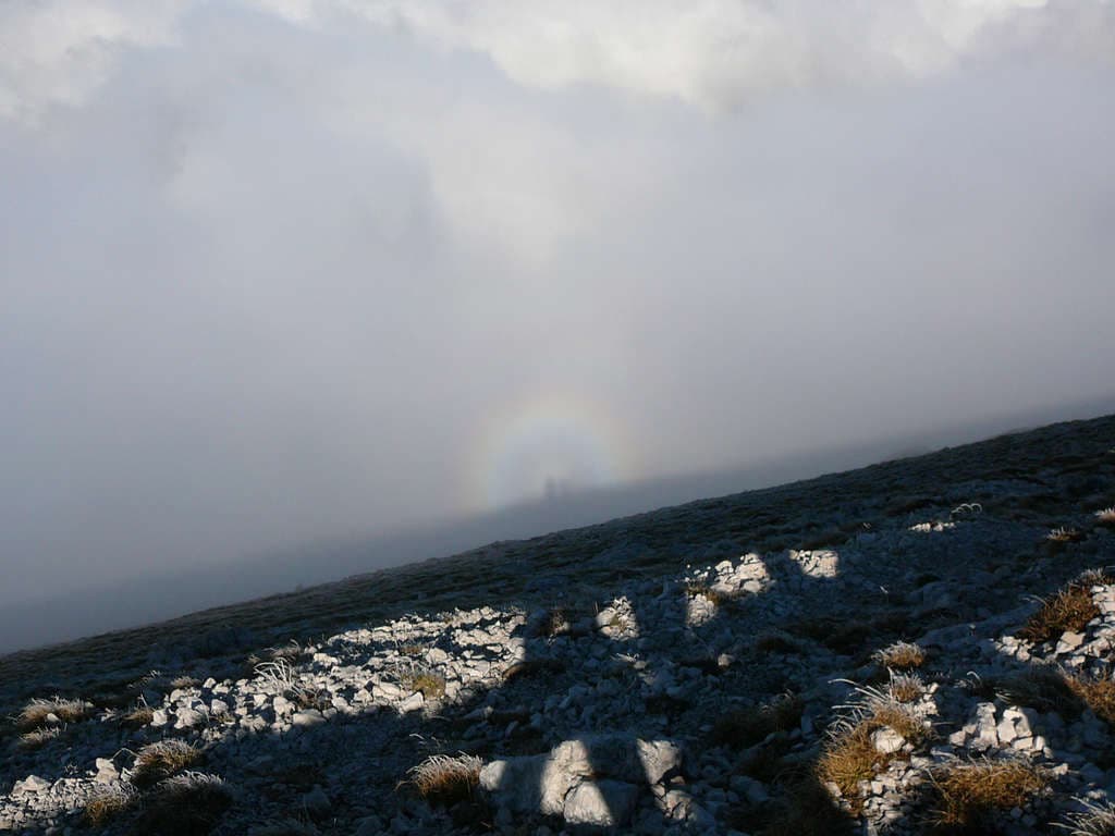 Básicamente este efecto se produce por la difracción de las gotitas de agua en las nubes, lo que hace que se produzca ese efecto de aureola alrededor del supuesto fantasma que parece perseguir al observador en la distancia o proyectado misteriosamente en el paisaje.