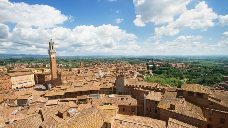 Siena es un pueblo medieval clásico, famoso en La Toscana por su Piazza del Campo, la plaza principal en forma de abanico, y por sus carreras de caballo en verano conocidas como Il Palio. El campanario de Siena, la Torre del Mangia, es el punto principal de atracción de la piazza. Además no hay que perderse la catedral ni los museos del lugar.