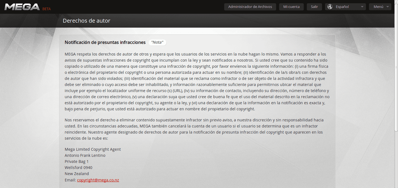 Por esta razón no hay leyes sobre derechos de propiedad que puedan aplicarse a la empresa, en otras palabras como diría Kim Dotcom la noche del lanzamiento de su nuevo servicio: "Si alguien envía algo ilegal a través del servicio postal no cerrarás la Oficina de Correo", esto es básicamente lo mismo.