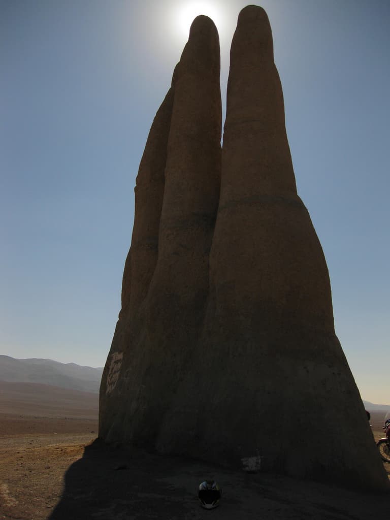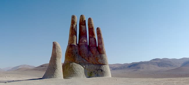 La Mano del Desierto es una creación del escultor chileno Mario Irarrázabal del año 1992. Ubicada en el medio de la nada, a 75 km de la ciudad de Antofagasta, esta mano que tiene los dedos apuntando hacia el cielo se ha convertido en uno de los principales destinos turísticos de la zona.