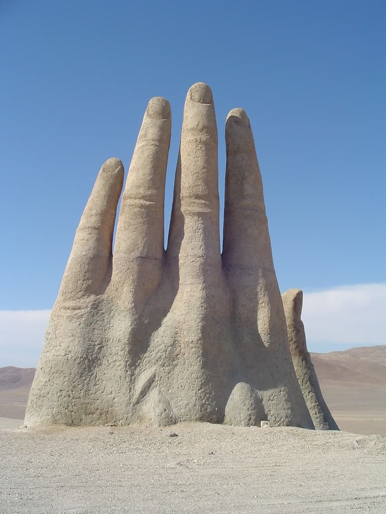 ¿Qué pasaría si en lugar de un oasis te encontraras con una gigantesca mano que se aparece por sobre la arena? Esta escena puede hacerse realidad si visitas la impactante escultura de una mano gigante que nace de las solitarias arenas del desierto de Atacama en el norte de Chile.