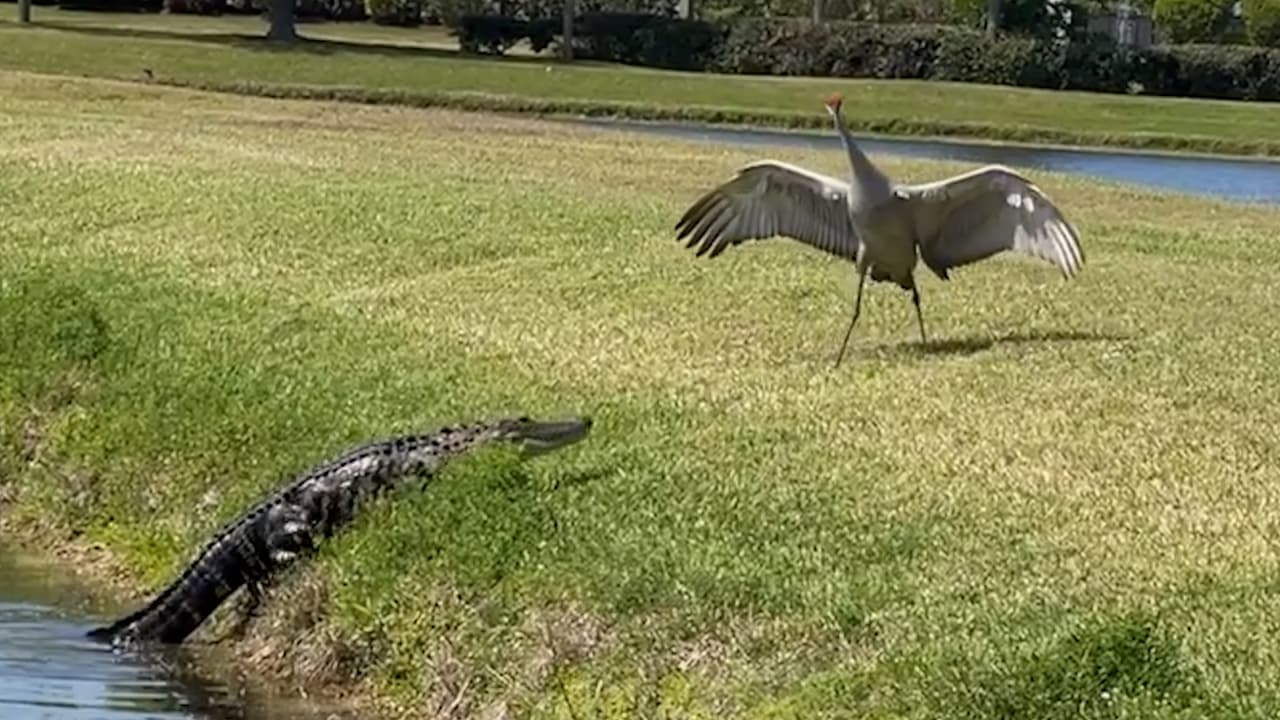Laura Akin, de Sarasota, pretendía tomar una foto a varias aves cuando se llevó una sorpresa: un reptil salió del agua. Sin embargo, una grulla le demostró que no le tenía miedo y el caimán desistió.