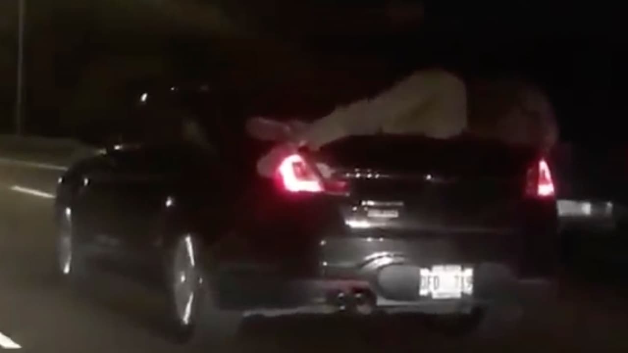 Por increíble que parezca, el hombre que estaba inconsciente sobre el baúl del Ford Taurus no cayó a la carretera. Al final, un policía fue quien hizo notar al desprevenido conductor que llevaba a un polizón en la parte trasera de su vehículo.