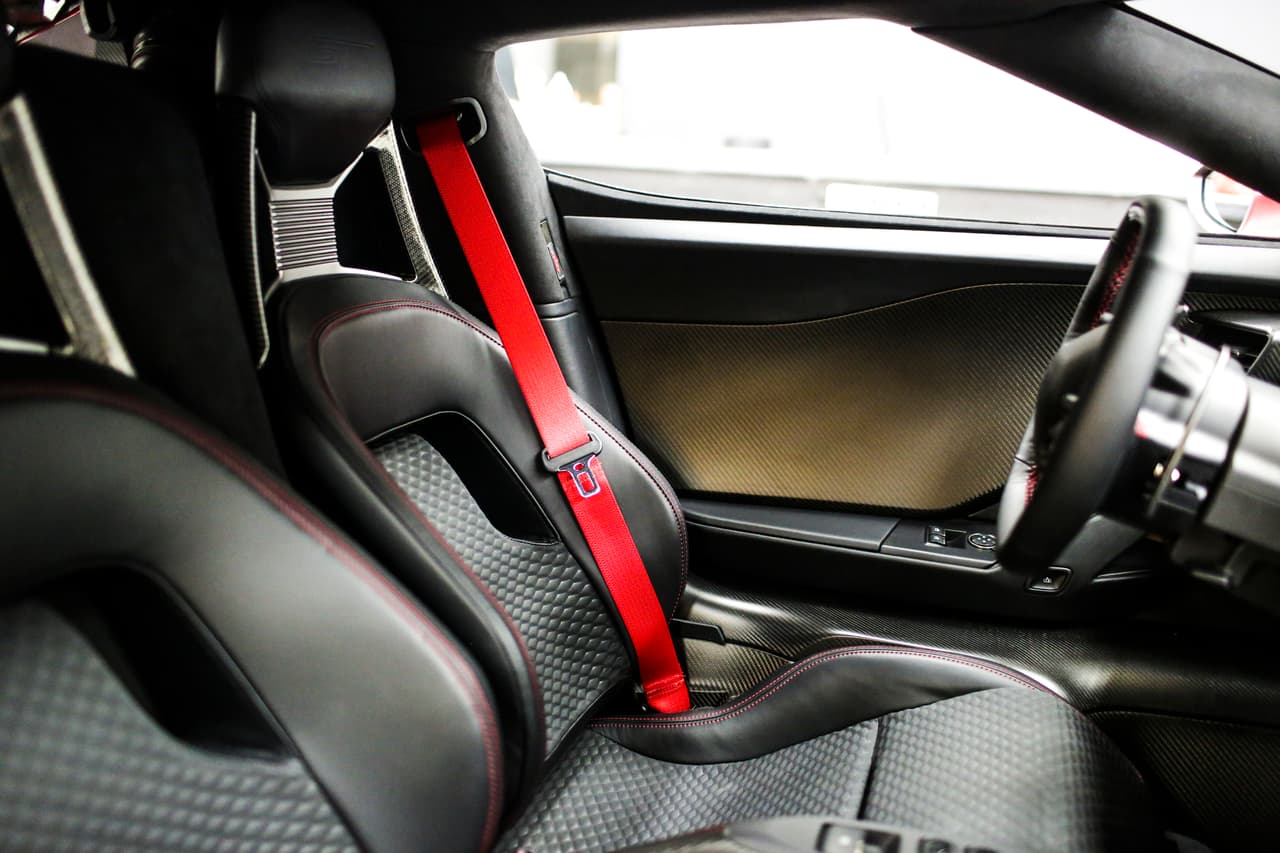 Sus asientos de fibra de carbono están envueltos en cuero con costuras rojas. Las costuras en su volante y sus cinturones de seguridad también son rojos.