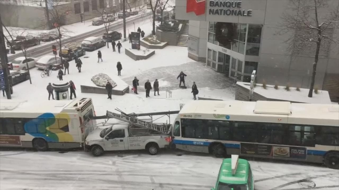 Fuertes tormentas de nieve causa que los autos patinen en una calle de la ciudad de Montreal