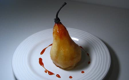 Claro que si no te gusta o no tienes a mano vino tinto, puedes preparar preparar esta variante de peras escalfadas con especias que se prepara con vino blanco.
