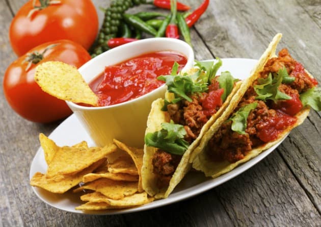 Los tacos son un plato de origen mexicano que consiste en una tortilla de maíz que se enrolla y en la que se colocan alimentos que pueden ser diferentes variaciones de carnes y verduras.