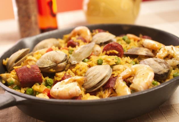 La paella es un plato típico de España fundamentalmente de Valencia. Hay muchas variaciones de la receta original pero consiste en un plato con numerosos ingredientes como carne, mariscos, cerdo, porotos, arroz, pimientos, y variados condimentos.
