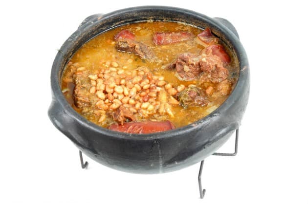 La feijoada es un plato característico de Brasil. Se hace con frijoles negros y trozos de cerdo o pollo. Y se le agrega arroz y también naranjas. Este plato también se come mucho en Portugal pero se cambian los porotos negros por los rojos o blancos.